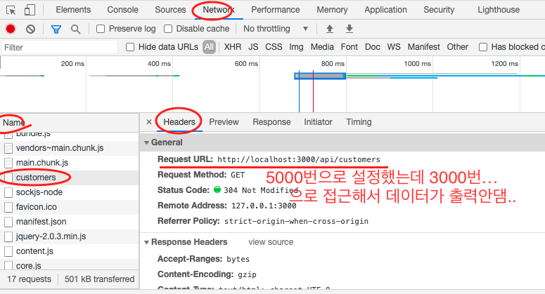 실제로는 proxy 설정에 의해서 5000포트에 접근해서 데이터를 받아오는 것이라고 한다.