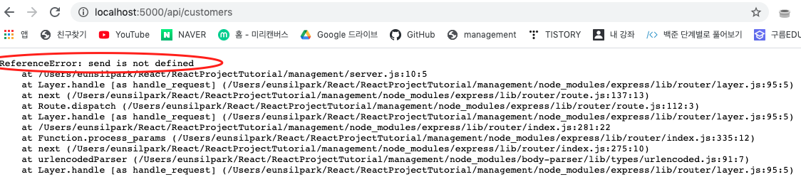 localhost:5000/api/customers 들어가니 저렇게 send is not defined 에러메시지와 함께 데이터가 출력되지 않았다.