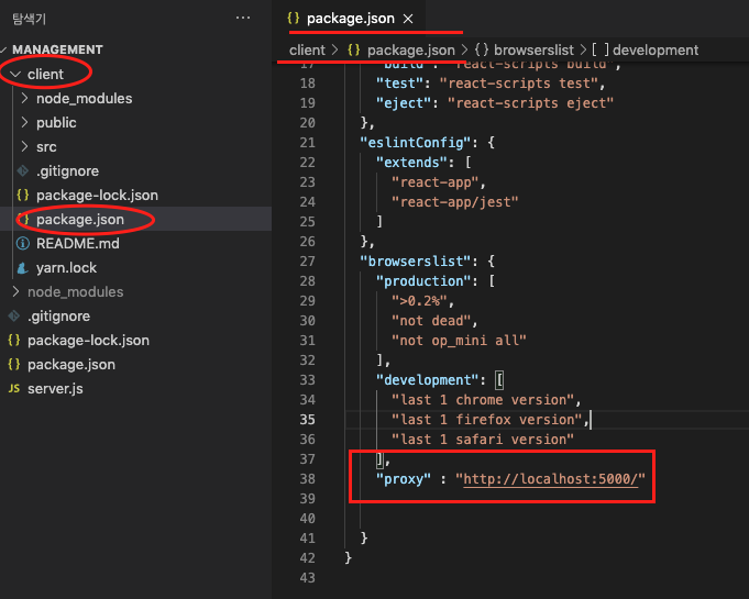 그리고, http-proxy-middleware를 사용하는 경우 client/package.json에는 proxy 설정이 있으면 안 된다.
