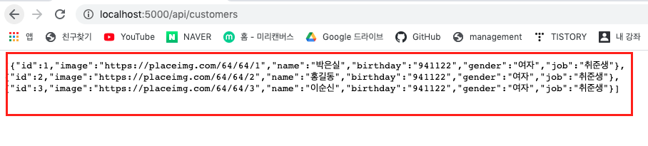//client가 /api/customers 경로로 접속을 하게되면 3명의 고객정보 데이터를 담고있는 배열 데이터를 json 형태로 반환할 수 있도록 하기